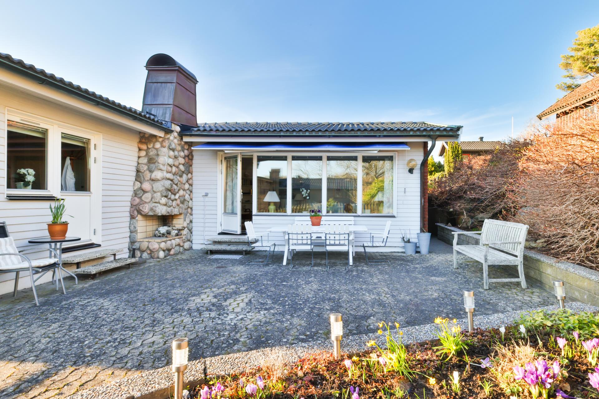 Jag älskar trädgården då det är ett stort intresse för mig. På baksidan är det en skön uteplats där de tidiga vårstrålarna värmer gott och även en allmänning vilket gör att det inte är någon bebyggelse tätt inpå och istället ett lugnt skogsparti.