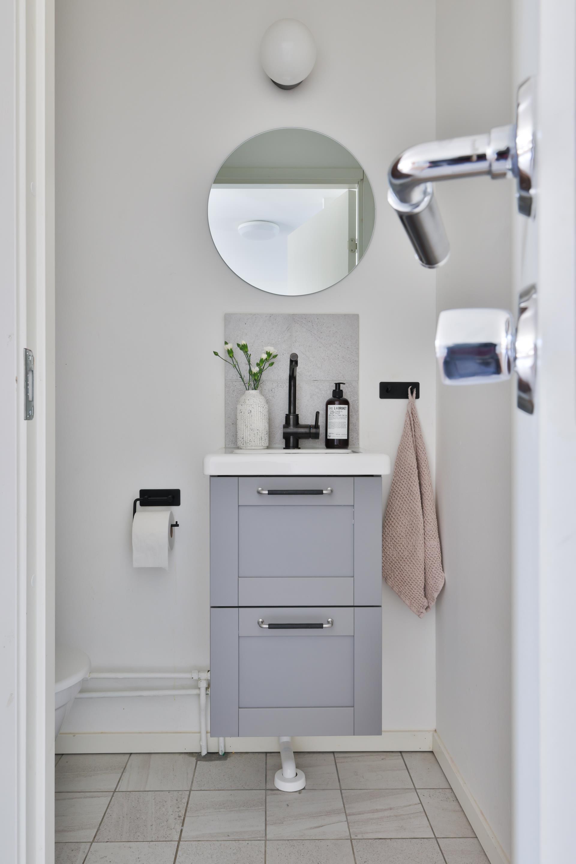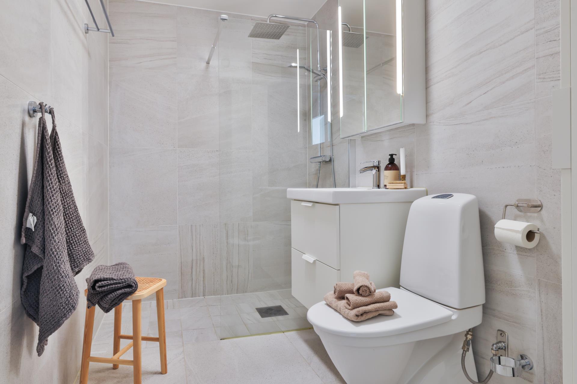 - Det helkaklade badrummet har golvvärme och moderna materialval