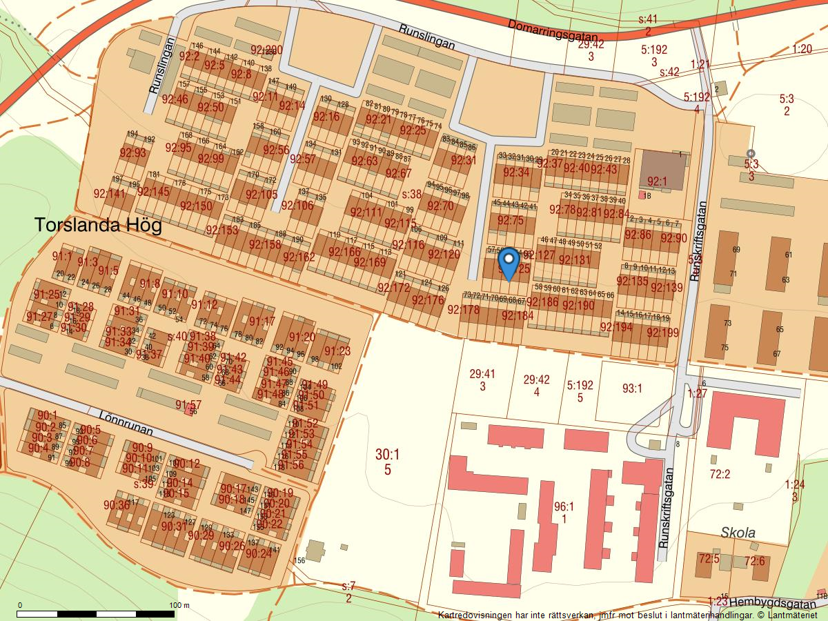 Runslingan är en lugn och omtyckt gata i Torslanda, belägen i ett av områdets mer etablerade och barnvänliga kvarter. Här bor du i ett naturnära och trivsamt bostadsområde med grönområden, gångvägar och lekplatser alldeles runt knuten. Bebyggelsen består främst av moderna radhus och villor med enhetlig arkitektur och välskötta tomter. Det är ett tryggt och välorganiserat område där grannsamverkan och gemenskap är tydliga inslag. Från Runslingan har du dessutom nära till både service, skolor och rekreationsmöjligheter – perfekt för dig som söker ett harmoniskt liv i en lugn miljö.