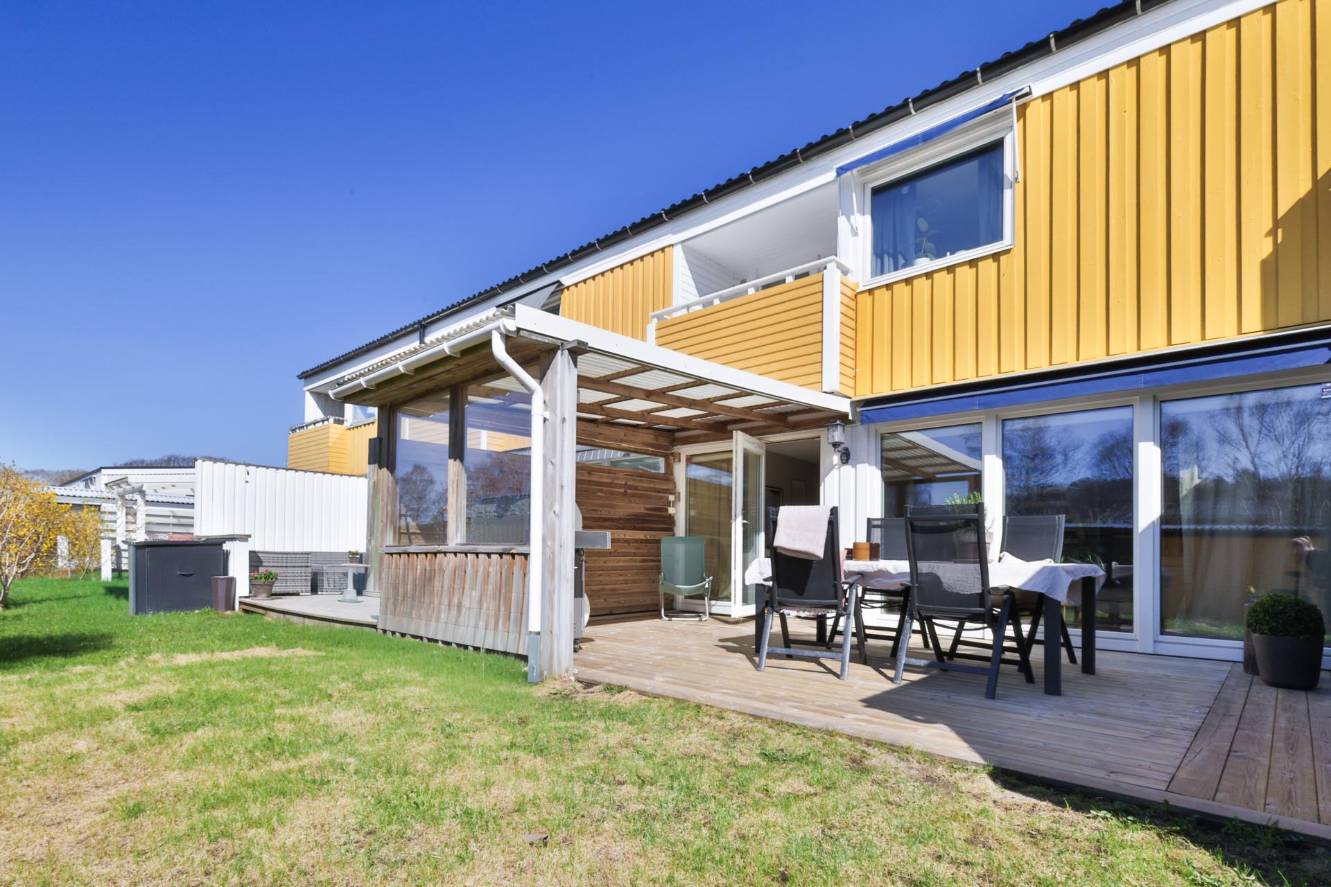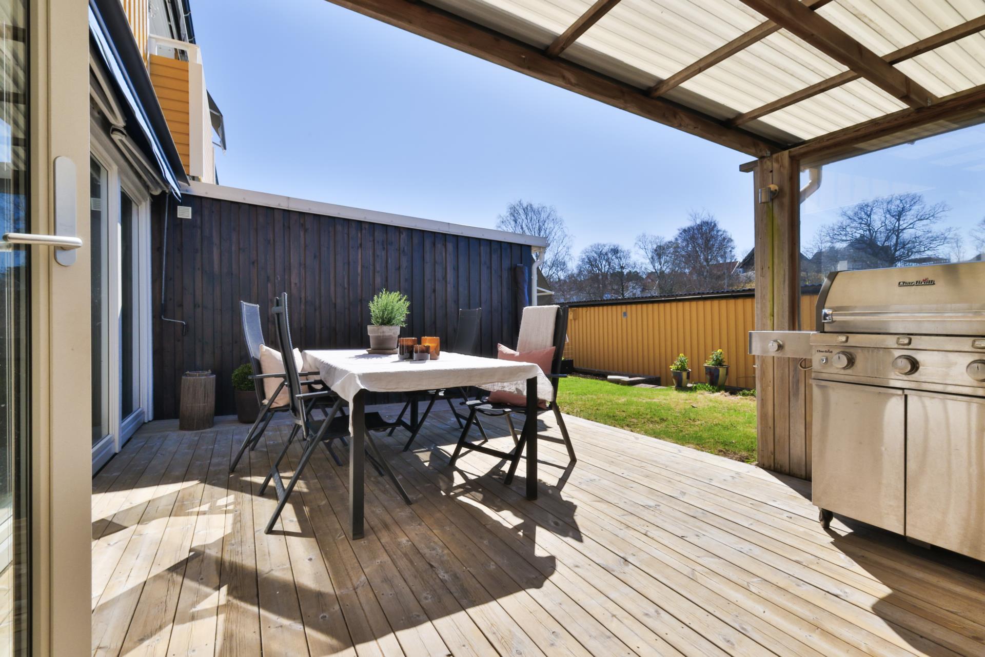 - Uteplats på baksidan i västerläge med altan och gräsmatta
