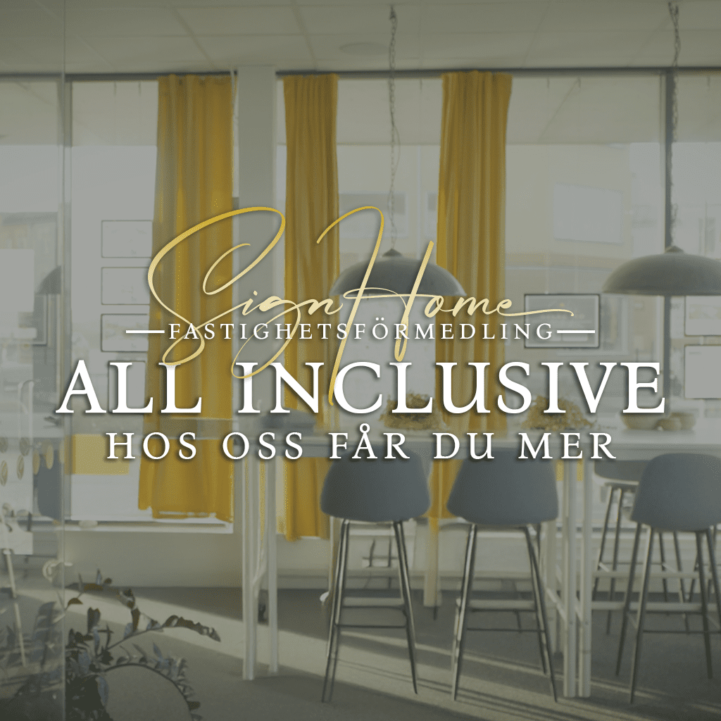Vi lanserar nu Signhome All Inclusive – ett komplett upplägg där allt ingår i provisionen. Inga tillägg för Hemnet, styling, besiktning, energideklaration osv, kostnader som annars ofta uppgår till 50 000–100 000 kr.